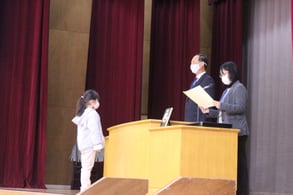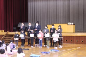 今日は2学期の終業式が行われました。初めに12月9日に行われた持久走記録会の表彰を行い、その後、図画や書写、家庭科などで優秀な賞に輝いた児童の表彰、そして、2学期の終業式を行いました。持久走記録会の表彰では、各学年男女上位3位までに入った児童が賞状をもらった後、練習を一日も休まずに取り組んだ児童の表彰も行われました。
